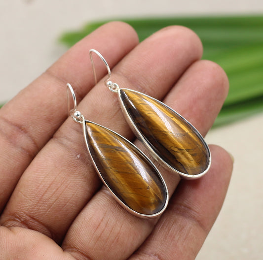 925 Sterling Silver Gemstone Jewelry,Tiger Eye long tear drop Earring,Brown Chunky Danglers,Birthday Gift,Big Gemstone Silver Dangler for Me
