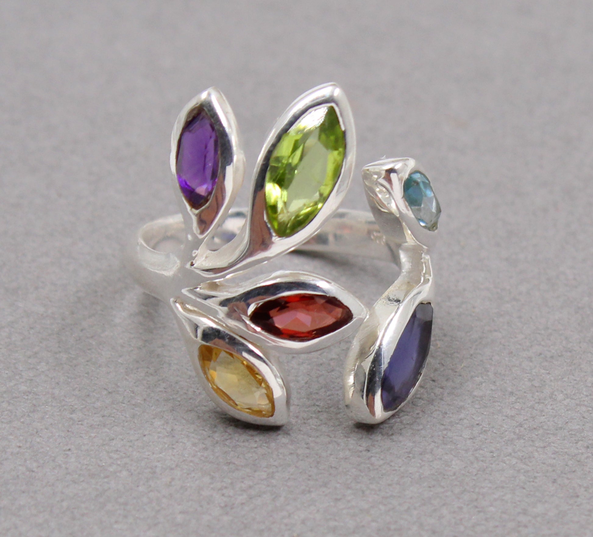 Multi Genuine Gemstones Ring,Front Open Ring,Nature Inspired Leaf Ring,Anniversary Gift,Bride,s Maid Gift,Birthday Gift