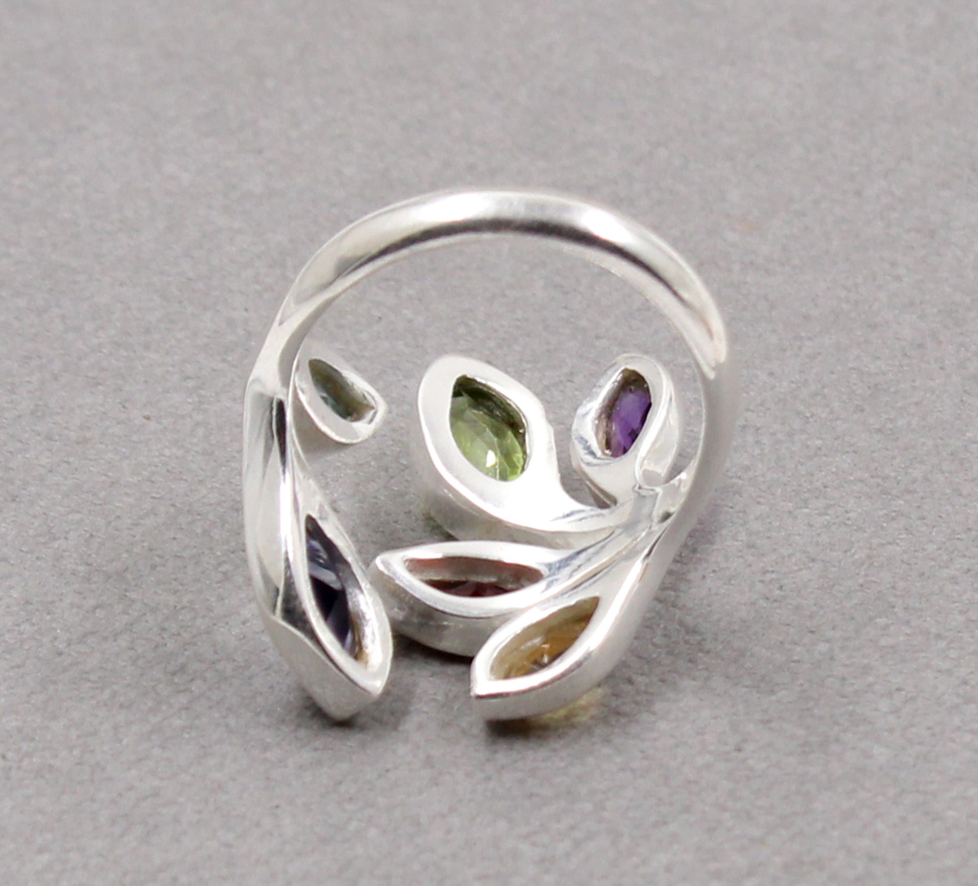 Gorgeous Colorful natural gemstones front open Designer Leaf Ring made of solid 925 sterling silver . It is an awesome joyous ring that woman of all ages would love to wear and flaunt at any party.The front open makes it slightly adjustable.Lovely Birthday gift for your daughter.Promise ring for your Girlfriend.